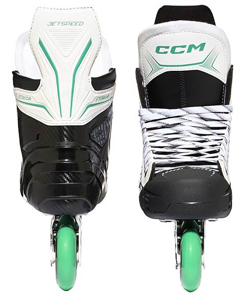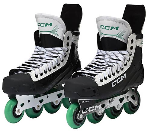For skating characteristics, the skate uses a two-piece Hi-Lo steel chassis designed for balance and agility. The CCM roller wheels are mounted in a staggered setup: smaller wheels support quick direction changes, larger wheels increase speed. With an 82A hardness, the wheels are built for durability and balanced grip on a variety of surfaces. ABEC 5 bearings round out the setup with smooth roll for training and recreational games.